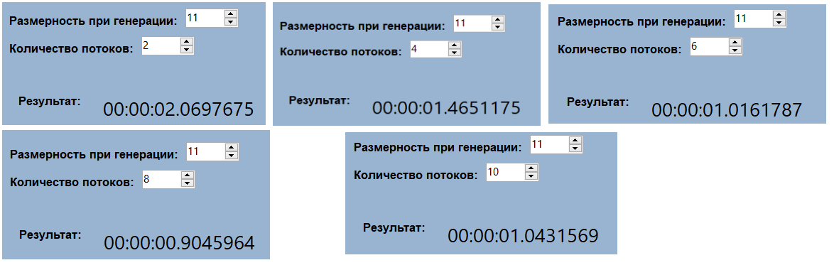 Сравнение обработки матрицы 11 на 11 на различном количестве потоков паралельного алгоритма.