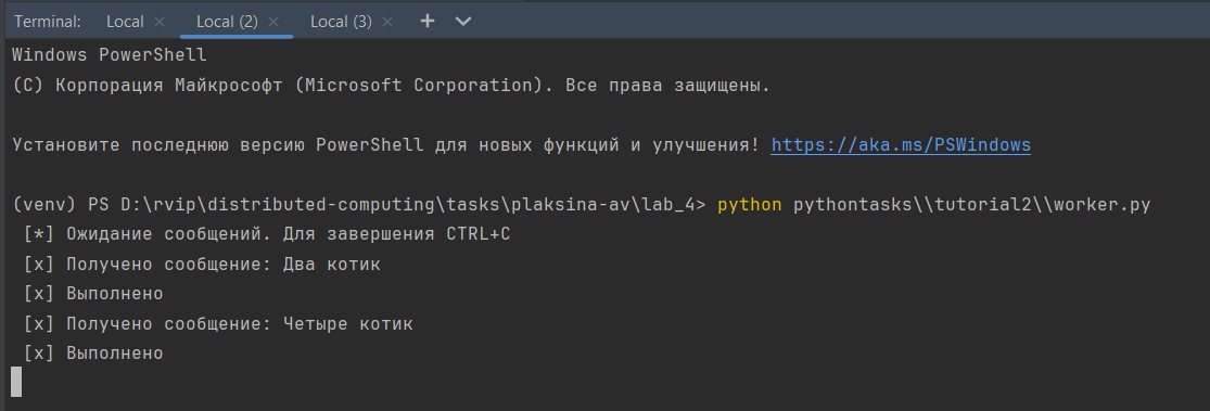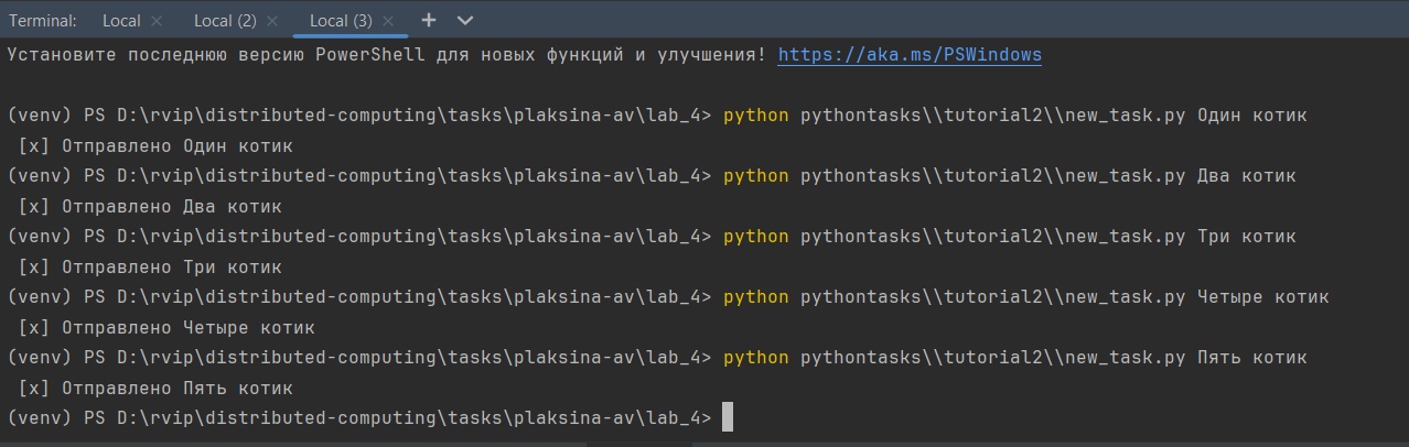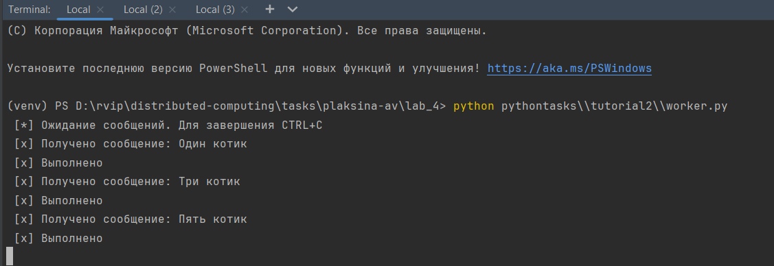 Открыли три терминала: в первых двух запустили поочередно потребителей worker.py. В третьем терминале запустили new_task.py и отправили пять сообщений.