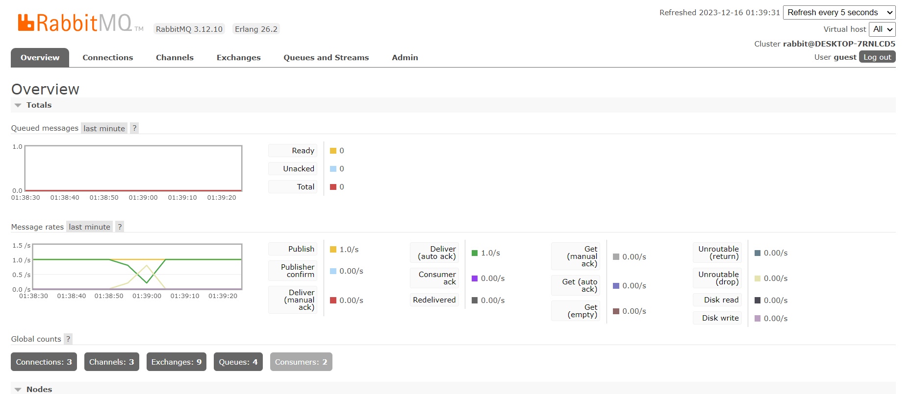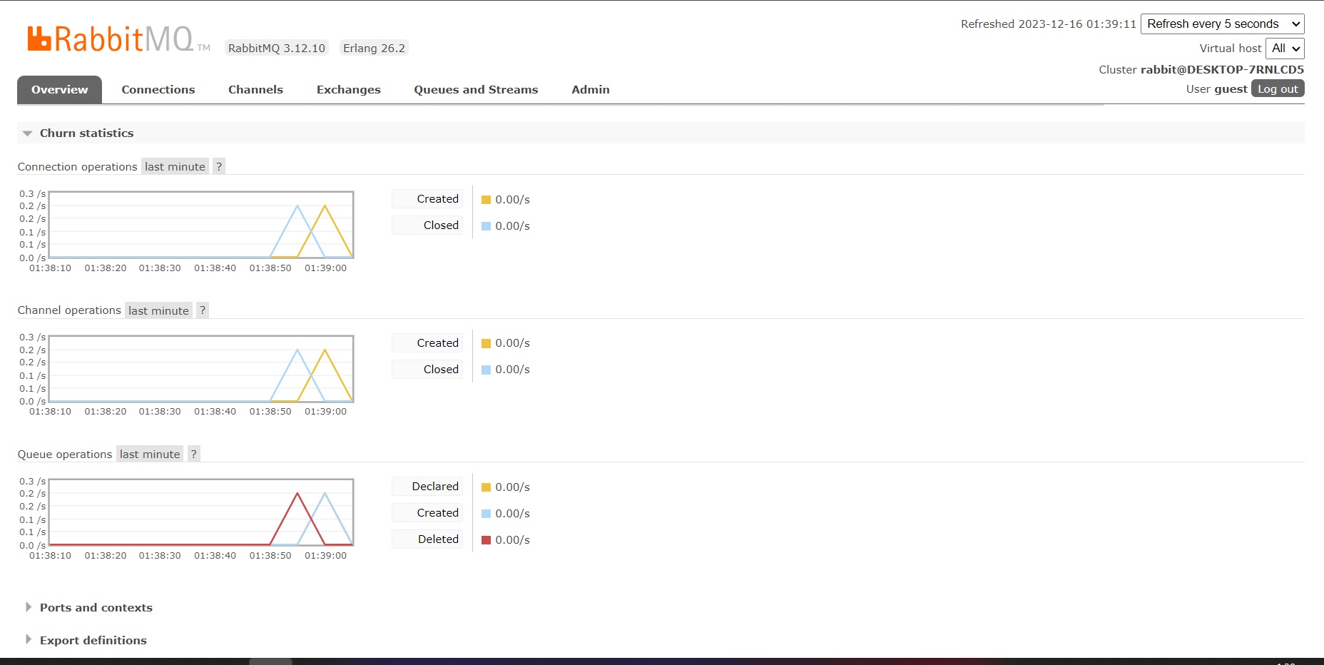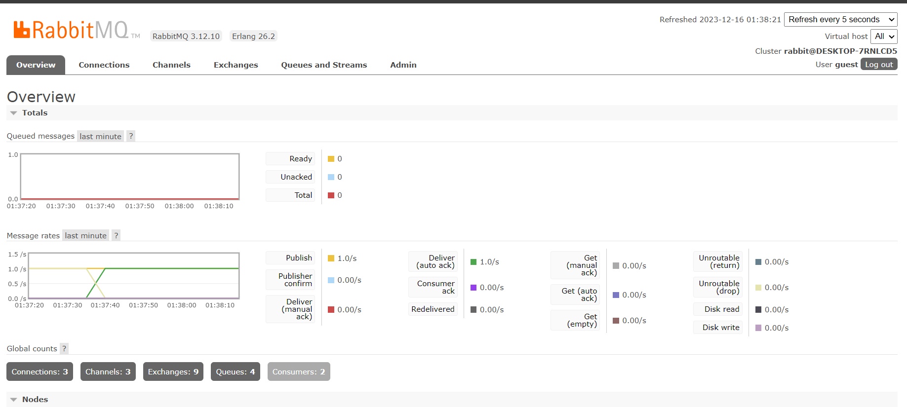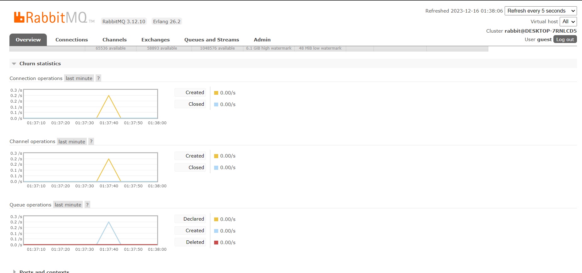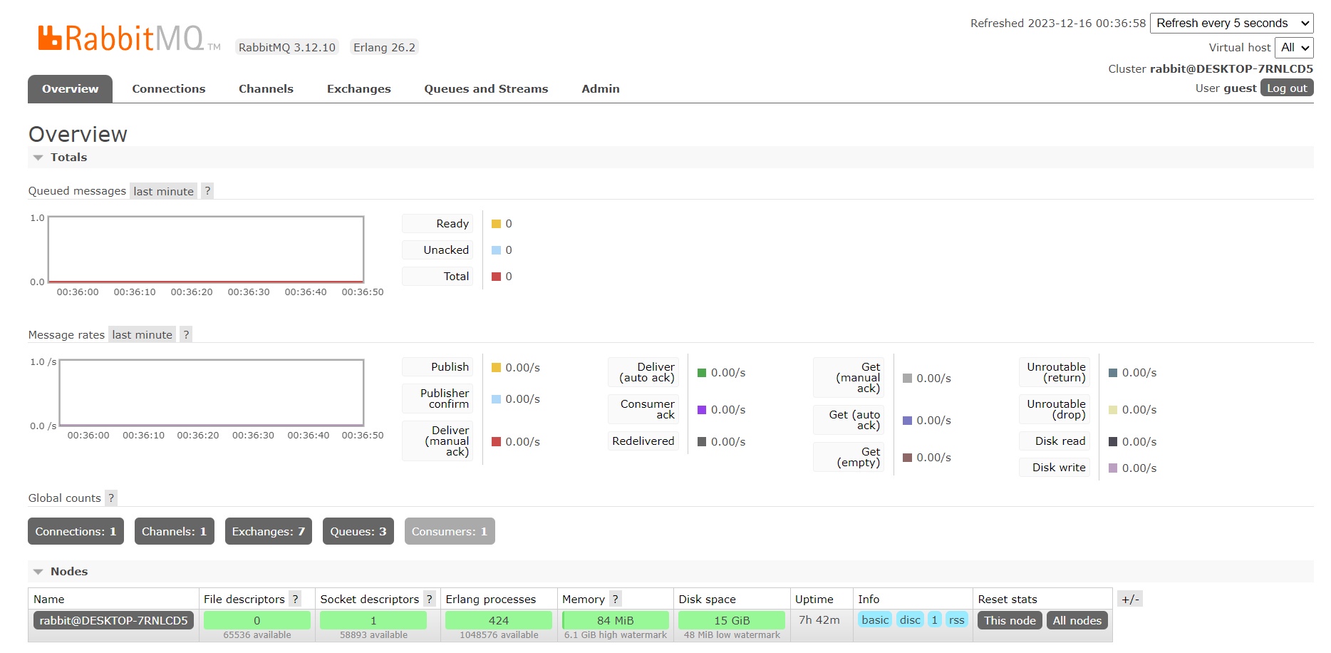 Установила RabbitMQ server, erlang и зашла в брокер под гостем по http://localhost:15672/#/