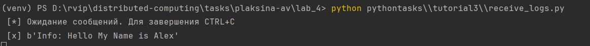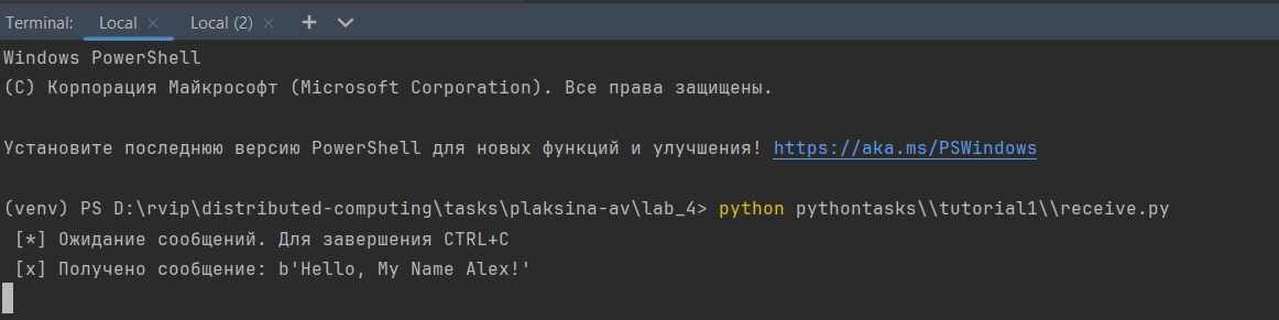 Сначала был запущен receive.py, который становится в ожидании сообщения. Затем запустили с отдельном терминале send.py, который отправил сообщение