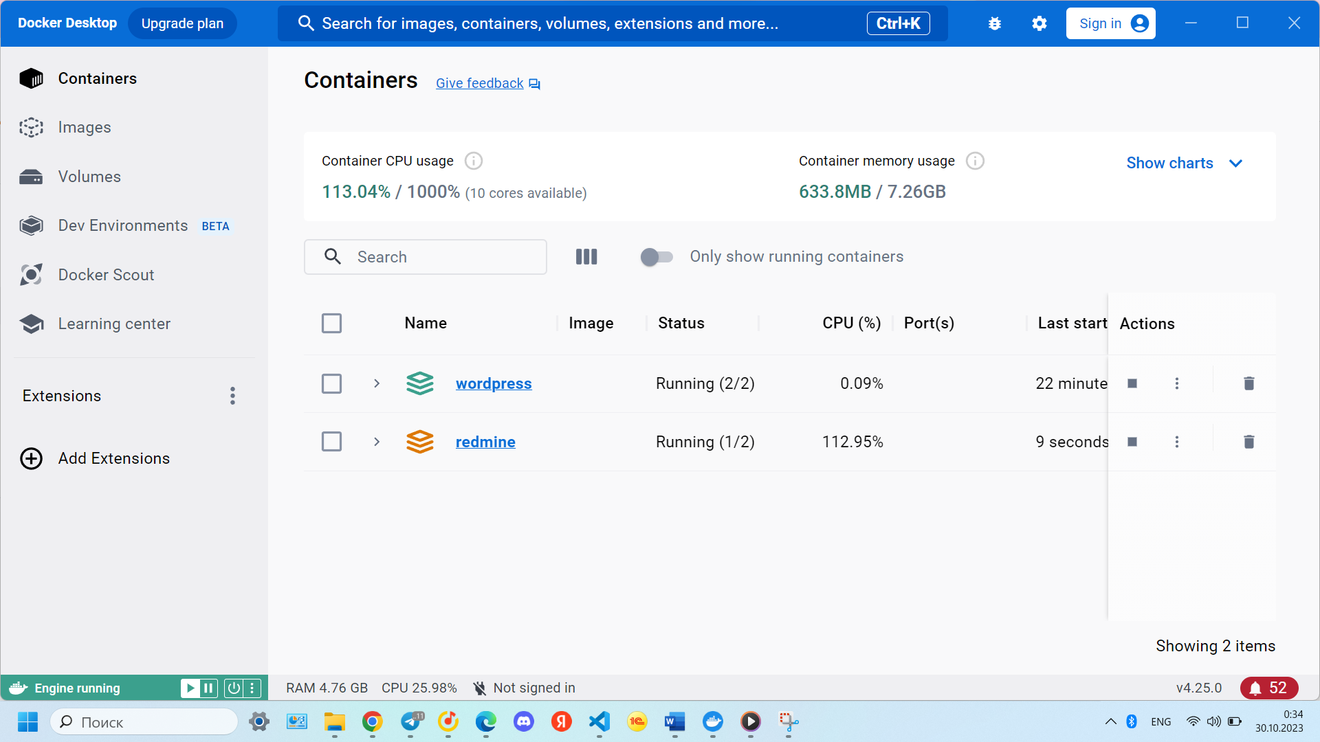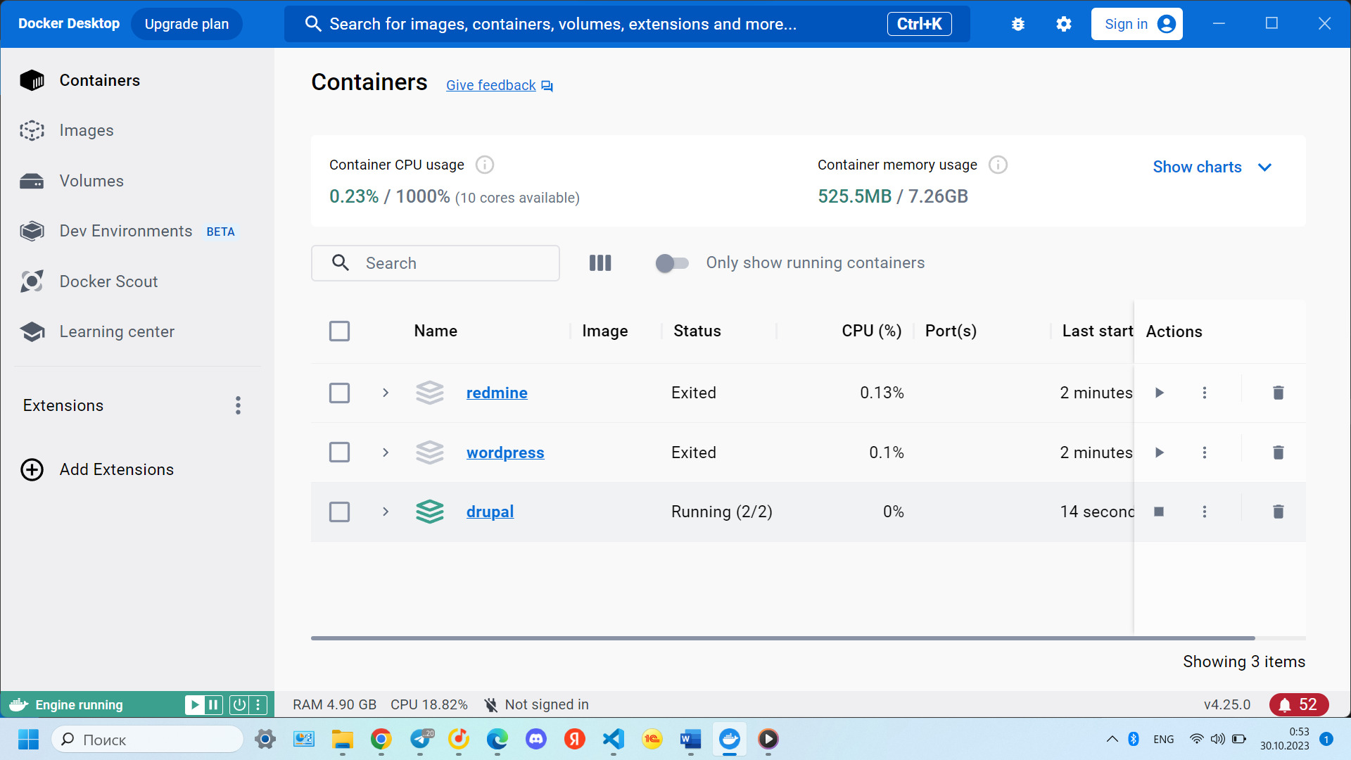 Открываем Docker Desktop и проверяем, что контейнер сервера базы данных и Drupal созданы и запущены: