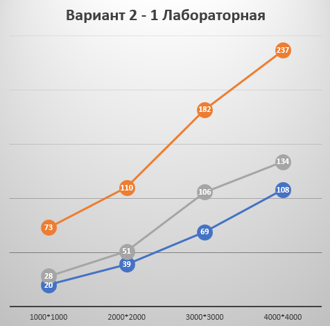 Однопоточный алгоритм показывает линейный рост времени выполнения с увеличением размера матрицы. Это ожидаемо, так как вычисления выполняются последовательно.